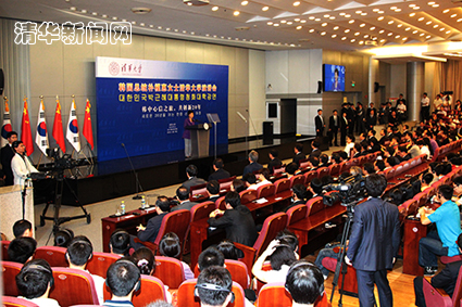 演讲前,刘延东、陈吉宁、胡和平等与朴槿惠总统在三楼会议室进行了简短会晤,并在清华校训“自强不息、厚德载物”背板前合影留念。